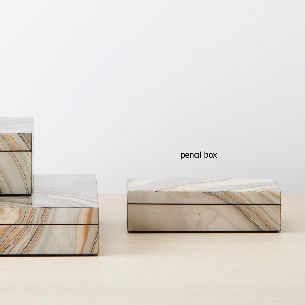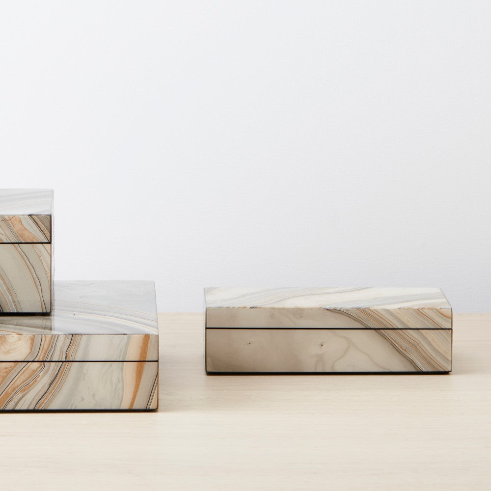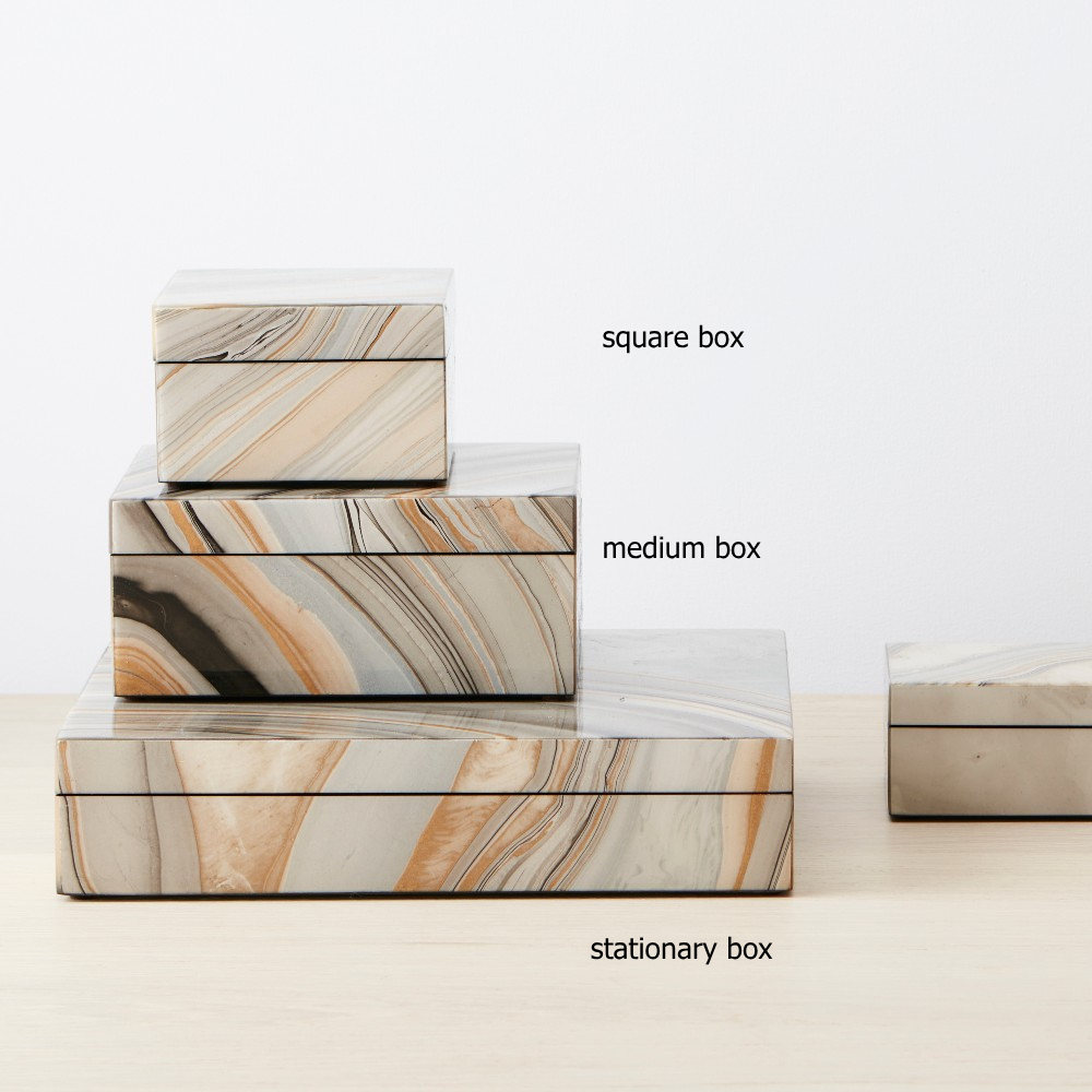 The art of marbleizing paper dates back to the twelfth century. Each inlaid paper is handmade so no two pieces will ever be the same. The lacquer is hand poured, dried and polished to show off the unique marbleized patterns. Available in 3 sizes and as trays.