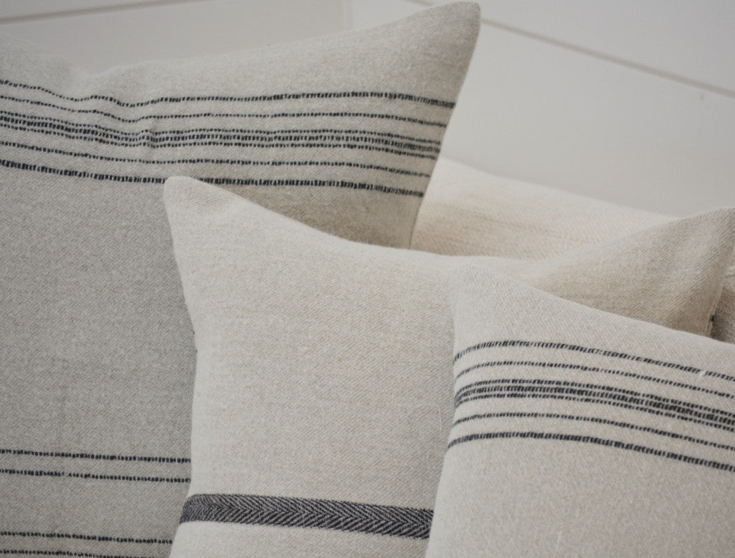 Inspired by Moroccan blankets found in markets, these pillows are made of two pieces sewn together in the center, creating asymmetrical black stripes sitting on a solid bone ground. Throw also available.
