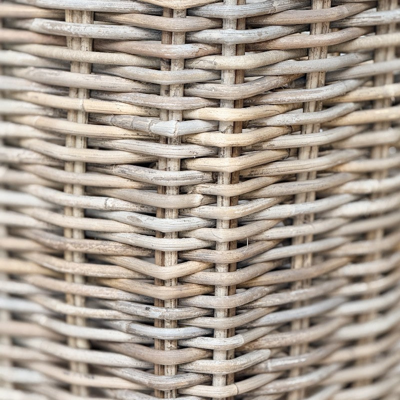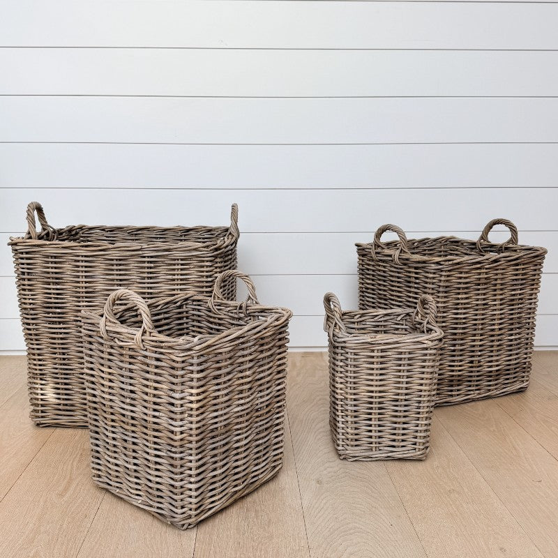 Square baskets with handles, handwoven from natural rattan. Colors and shapes may vary slightly due to nature of materials. Available in 4 sizes. |