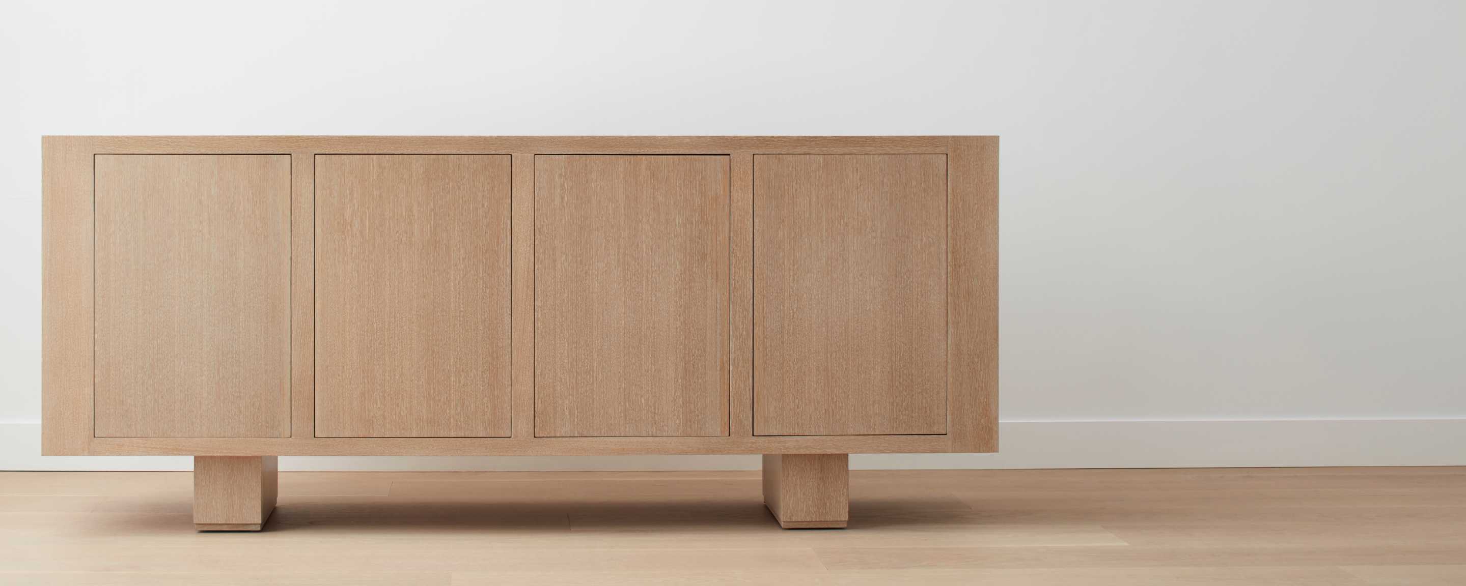For those who prefer a strong silent style, the Further Lane buffet table is hand crafted of rift white oak with a hand applied cerused finish. Unmarred by hardware, it has a clean overall look. Each of the four doors conceals an adjustable shelf. Finished with a water based conversion varnish for durability and resistance to yellowing and moisture damage. A homenature exclusive, made in the USA.