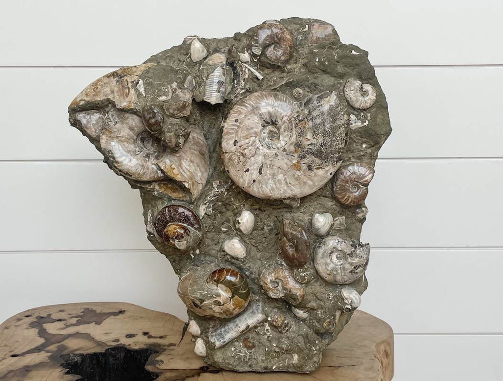 While on a buying trip these spectacular natural sculptures stopped us in our tracks. These "clusters" consist of fossilized ammonites and clams. It is rare to find such a large specimen, typically these are broken apart once they are unearthed.