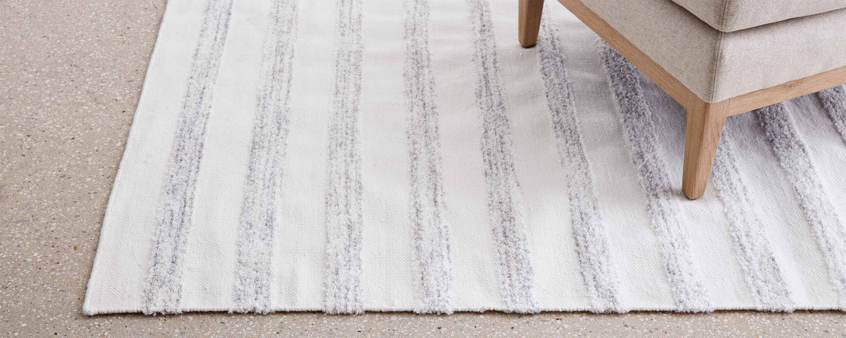Our Acadia Tide flat weave has super-soft light grey stripes made from a lofty mohair boucle blend, with a snow-white ground. It’s hand woven in the Himalayas, using age-old techniques, and is also available with white, or grey stripes. Available sizes: 4'x6' |