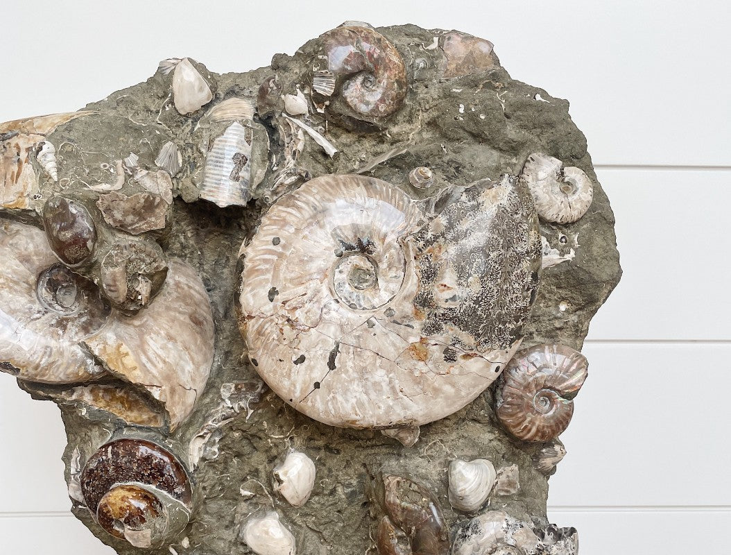 While on a buying trip these spectacular natural sculptures stopped us in our tracks. These "clusters" consist of fossilized ammonites and clams. It is rare to find such a large specimen, typically these are broken apart once they are unearthed.