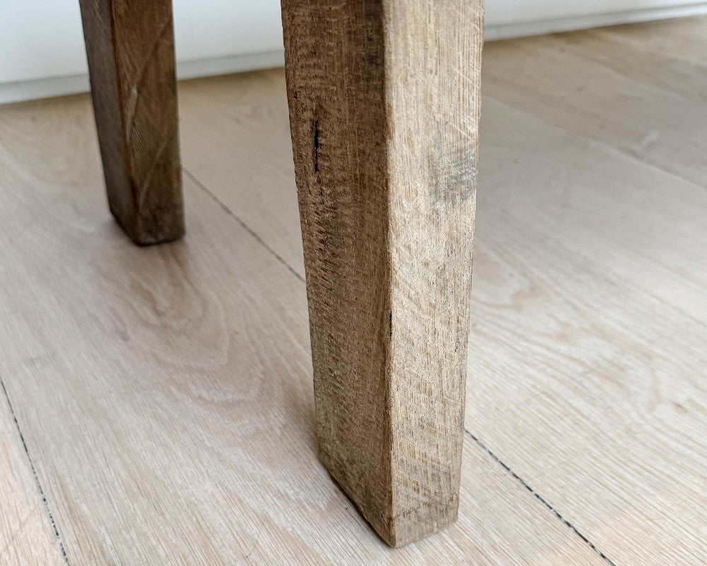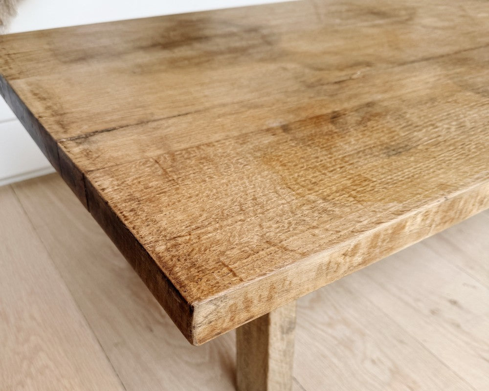 This vintage bench/coffee table exudes rustic charm and history. Crafted from durable wood, the table has a solid, sturdy structure with a wide, thick top.