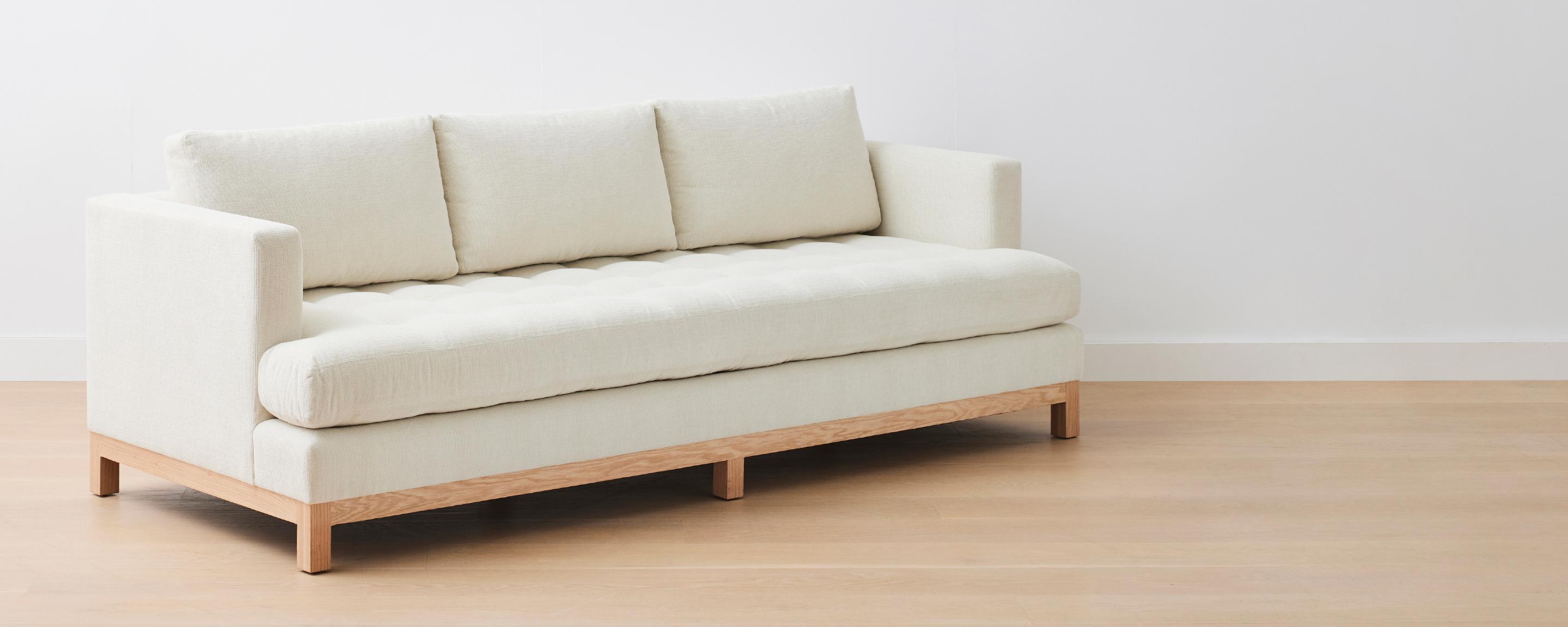 the storyOne of our best sellers, the Del Mar can be configured in dozens of ways to suit your needs. It is a generously sized sofa, with a slightly higher seat than some of our other sofas, and a 50/50 fill bench cushion that wears well and is so comfortable, some clients use this in lieu of a twin-sized bed. The streamlined design seems to float on a handcrafted wooden base, and has slightly slimmer arms, so you can comfortably pile on the kids and the dog for an afternoon of lounging. The Del Mar is available with or without the button tufting pictured above. |