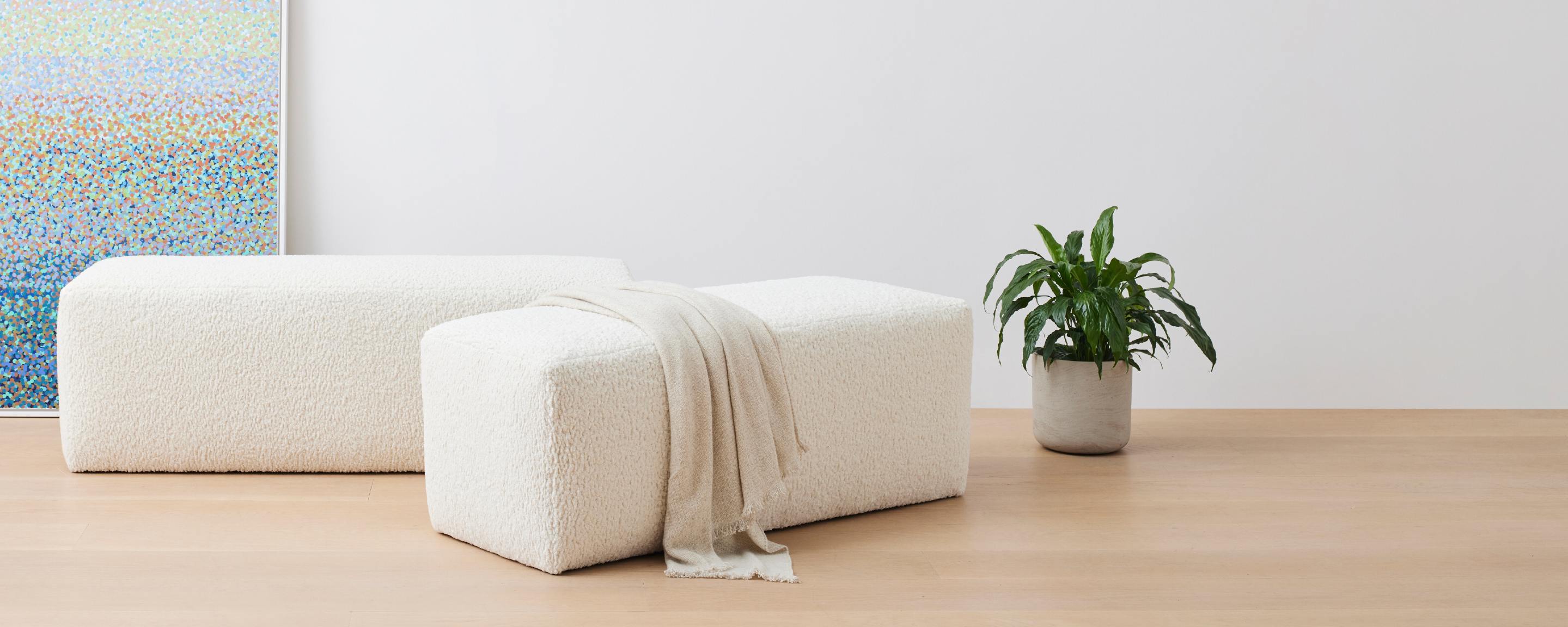 The sea cliff bench is a perfect solution for extra seating and can be tucked under tables, in foyers, or at the foot of a bed. Crafted in North Carolina with a sturdy hardwood frame. Also available as the sea cliff cube ottoman |