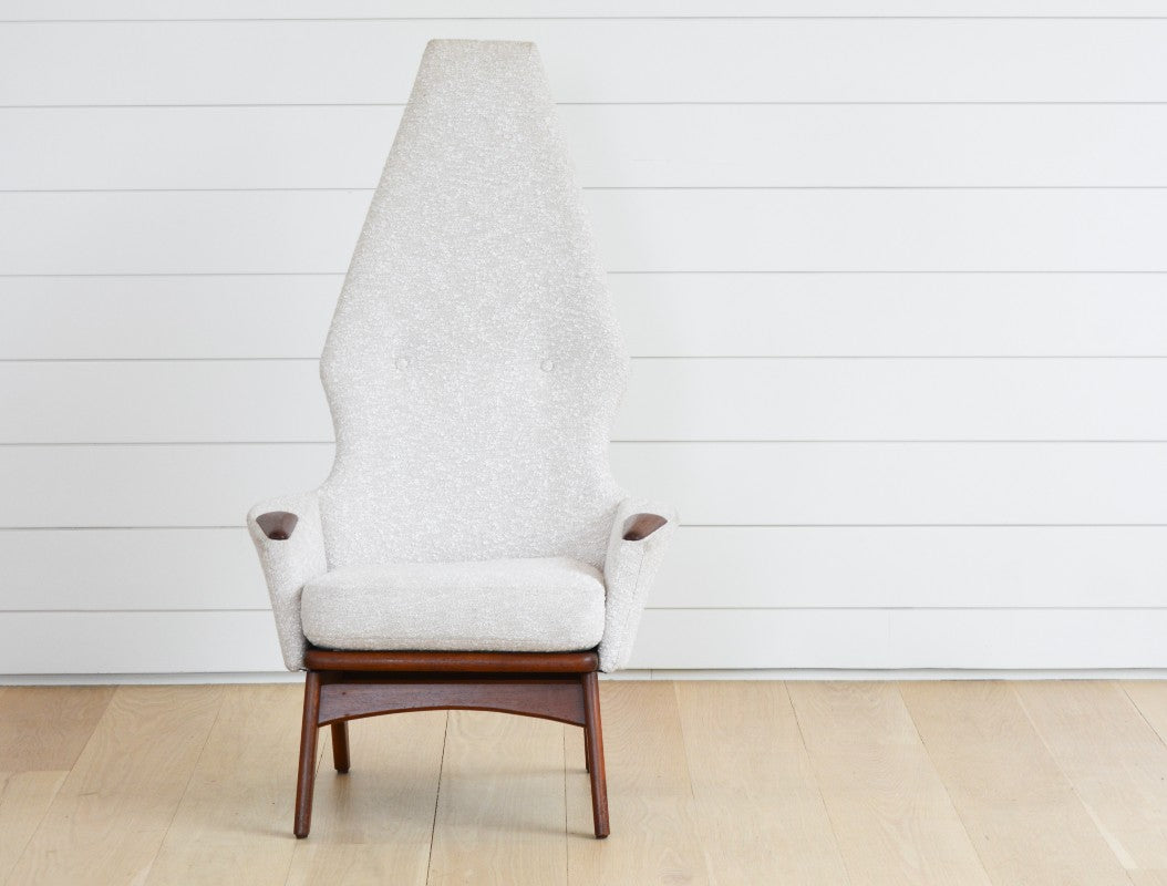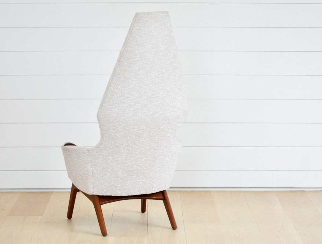 High back Adrian Pearsall angular chair with walnut frame and armrests. Newly reupholstered in a boucle fabric.