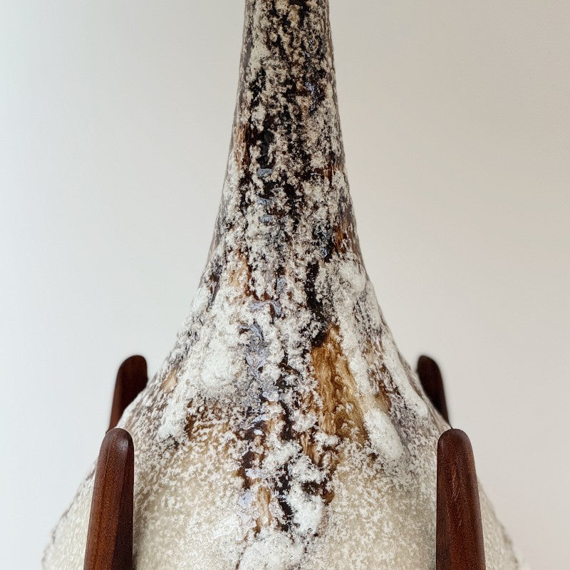 Vintage ceramic lamp with a drip detail and a wooden frame to hold the base.